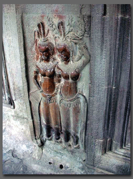 Apsaras are angelic deities. This stately duo is in the second level inner courtyard. Hundreds of thousands of hands have touched them in prayer creating a lustrous patina on the sculpture.