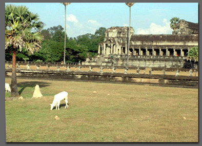Angkor Wat is an active religious temple within a village environment. Local farmers graze their cattle in the inner courtyard and fish in the wide moat surrounding the outer perimeter.