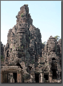 The Bayon temple, about a half mile from Angkor Wat, features 54 towers of four-sided Bodhisattva faces, a venerable Buddhist image. Built a century after Angkor Wat, the Bayon represented the change from Brahaminism to Buddhism as the official state religion. All the temples are now active Buddhist religious shrines.